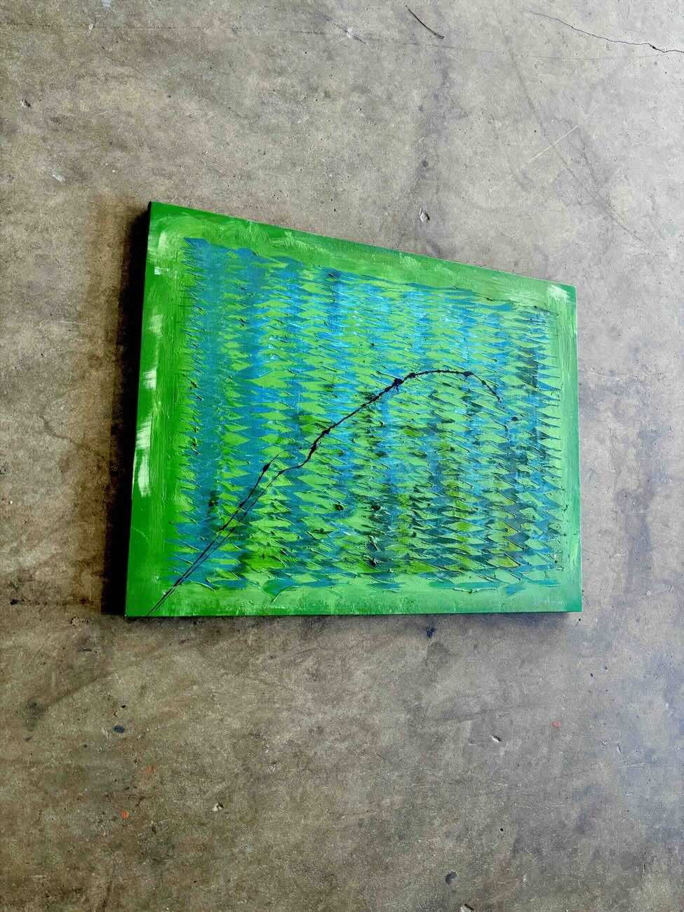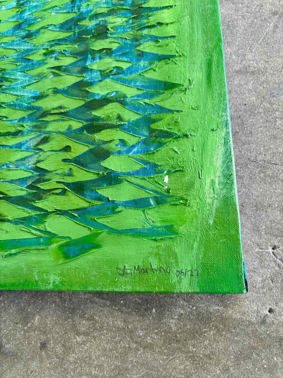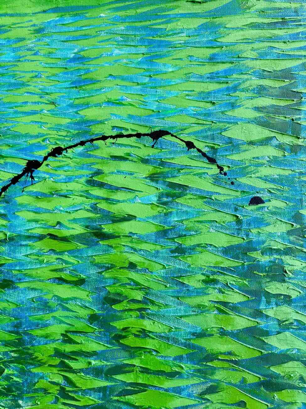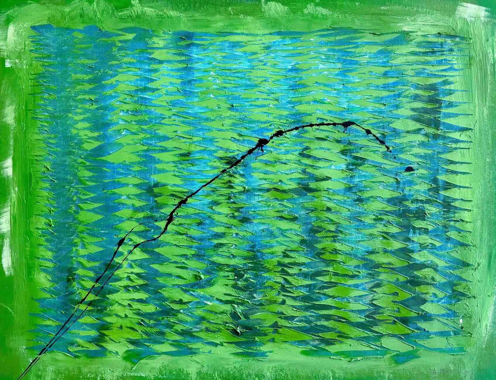 Mit Origin möchte ich den Ursprung allen Lebens sichtbar machen: die untrennbare Verbindung von Erde und Wasser. Das kräftige Grün erinnert an die Frische einer Wiese, das Blau an den Fluss des Wassers – beides ist für unser Überleben unverzichtbar. Durch meine Spachteltechnik entsteht eine vibrierende Tiefe, die Bewegung und Lebendigkeit spürbar macht. Dieses Werk ist eine Einladung, die Natur nicht nur zu betrachten, sondern ihren Wert neu zu erkennen und zu bewahren. Entdecken Sie in Origin die Quelle unseres Daseins.